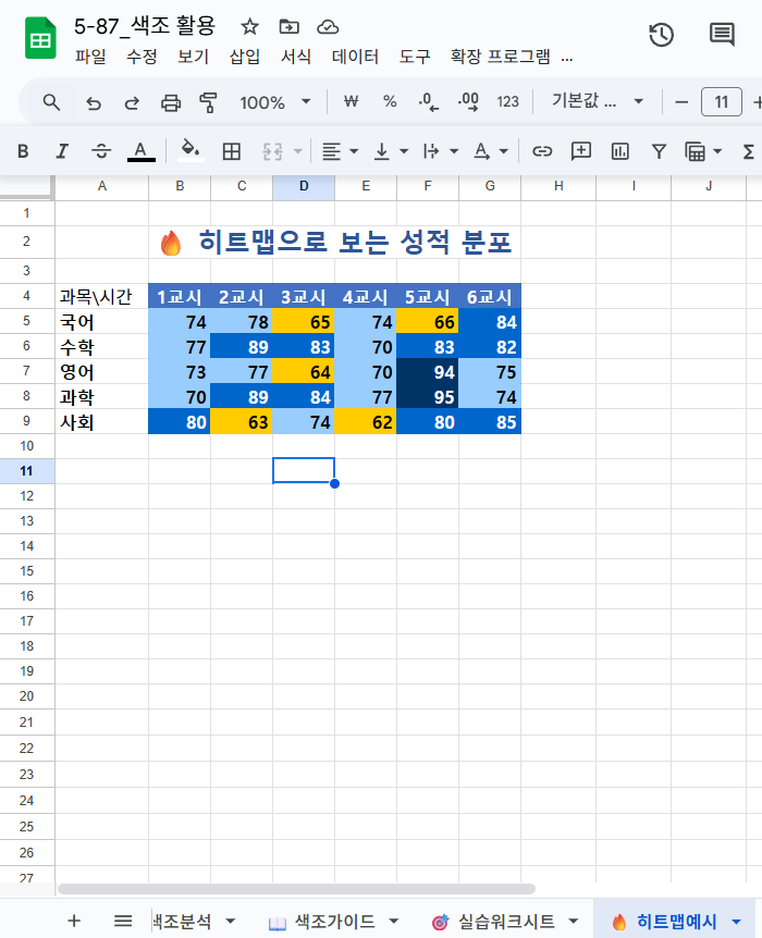 색조는 조건부 서식의 색상 스케일 기능을 통해 구현되며, 최솟값과 최댓값 사이의 모든 값을 연속적인 색상 변화로 나타냅니다. 예를 들어, 학생들의 시험 점수가 30점부터 100점까지 있다면, 30점은 진한 빨간색, 65점은 노란색, 100점은 진한 파란색으로 자동 표시됩니다.