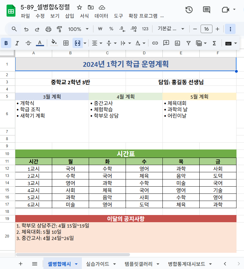 · 셀병합예시: 실제 병합이 적용된 학급 운영계획서 템플릿
