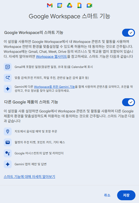 - 'Gmail' → '설정' → ' Workspace 스마트 기능 설정 관리'