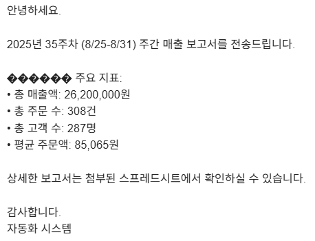 body += weeklyData.period + " 주간 매출 보고서를 전송드립니다.\n\n";