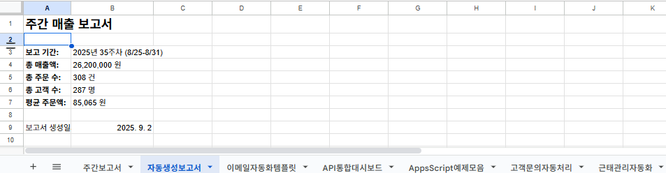 reportSheet.getRange("B5").setValue(weeklyData.orders + " 건");