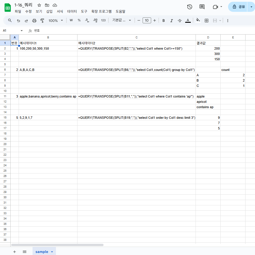 3,apple,banana,apricot,berry,contains ap,'=QUERY(SPLIT(B3,","),"select Col1 where Col1 contains ''ap''")' 결과:apple,apricot
