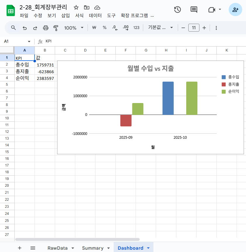 o 시트2 Summary : 월별 집계 테이블(월, 총수입, 총지출, 순이익)