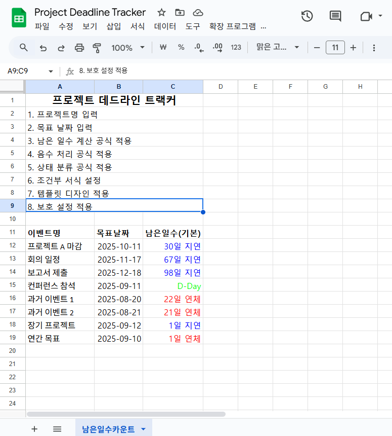 6) [빨강]# "Days Overdue";[파랑]# "Days Remaining";[녹색] "Today"