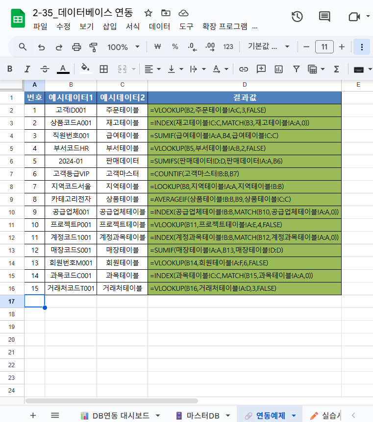 🔗 연동예제: 50개의 다양한 데이터베이스 연동 함수 예제가 실제 수식과 함께 적용되어 있습니다. VLOOKUP, INDEX/MATCH, SUMIFS, COUNTIFS 등 모든 주요 연동 함수의 실무 활용 사례를 확인할 수 있습니다.