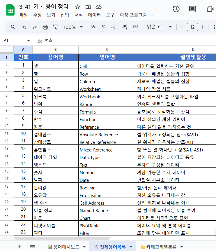 1. 워크북 생성 후 기본 시트(예: “용어정리”) 준비